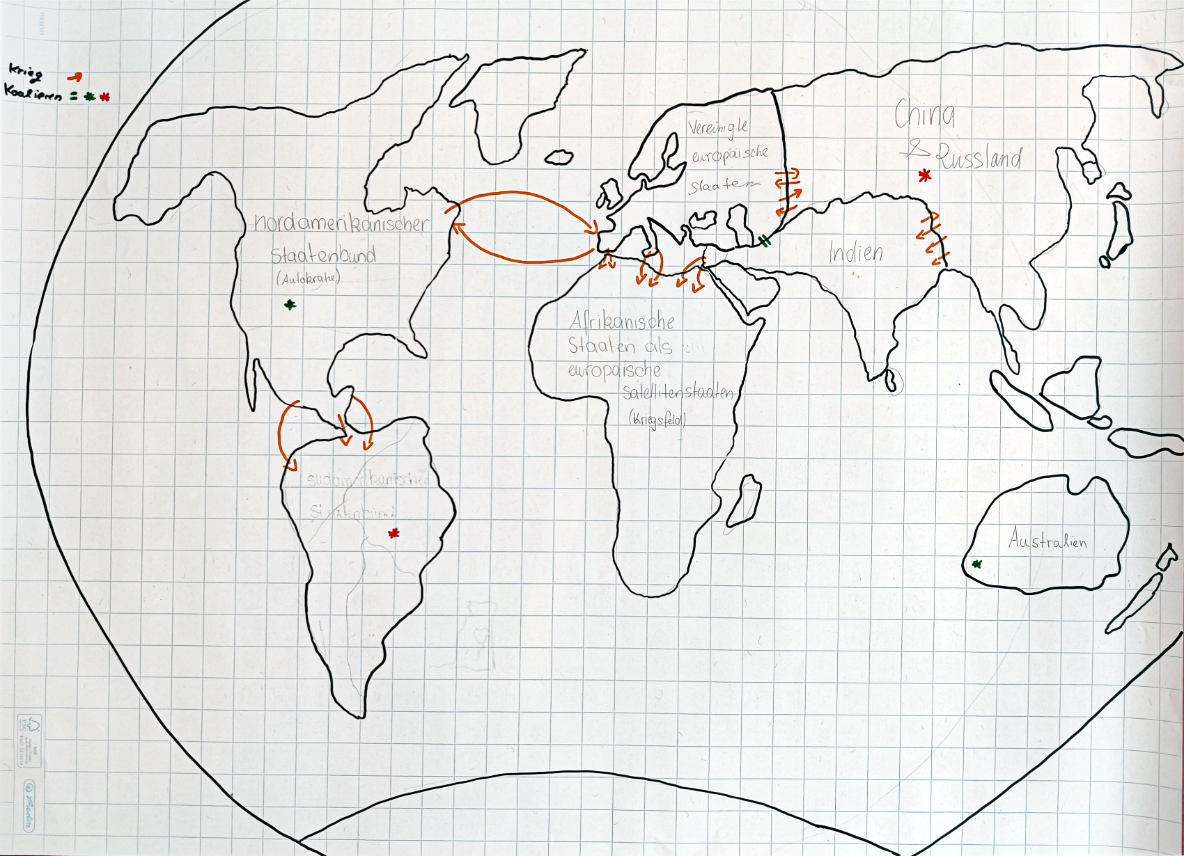 Als Reaktion auf Trumps jahrelange Zollpolitik brachen Wirtschaftskriege zwischen den Großmächten aus. Das Leben wurde immer teurer. Die Kriege werden als hybride Kriege geführt, in Form von Angriffen auf die Infrastrukturen. Der Krieg läuft im Hintergrund und wird das neue ‚Normal‘.