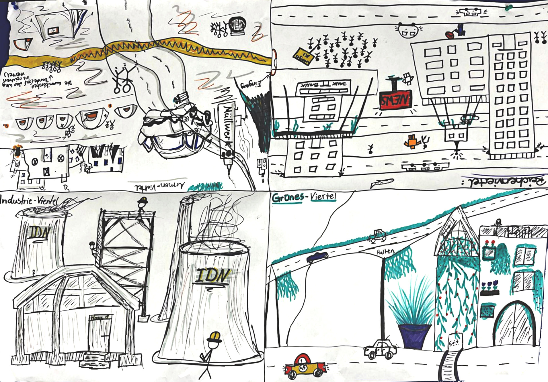 Im Grünviertel fahren die Autos mit Wasserstoff und sind von oldtimerstil bis total modern. An den Häusern und überall am Straßenrand sind Pflanzen für die Photosynthese. Straßen sind auf Stützen gebaut, damit auf dem Boden mehr Platz für andere Dinge ist.