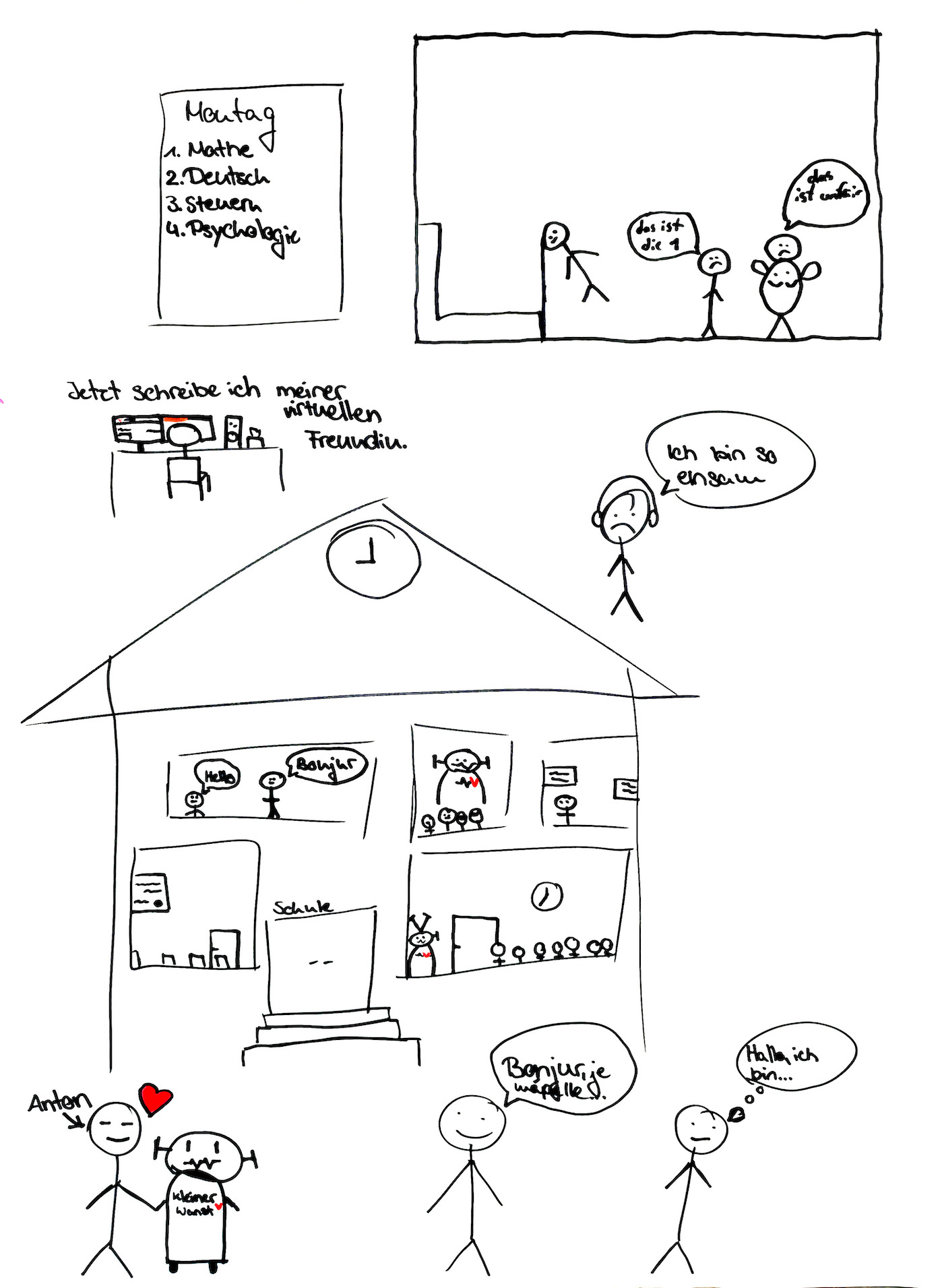 Sobald ich zuhause bin, gehe ich an meinen PC und schreibe mit meinen virtuellen Freunden und wir treffen uns dann virtuell in Tokyo. Eigentlich wollte Maxim noch dabei sein, aber der war leider schon verplant. Er trifft sich mit seiner KI-Freundin.