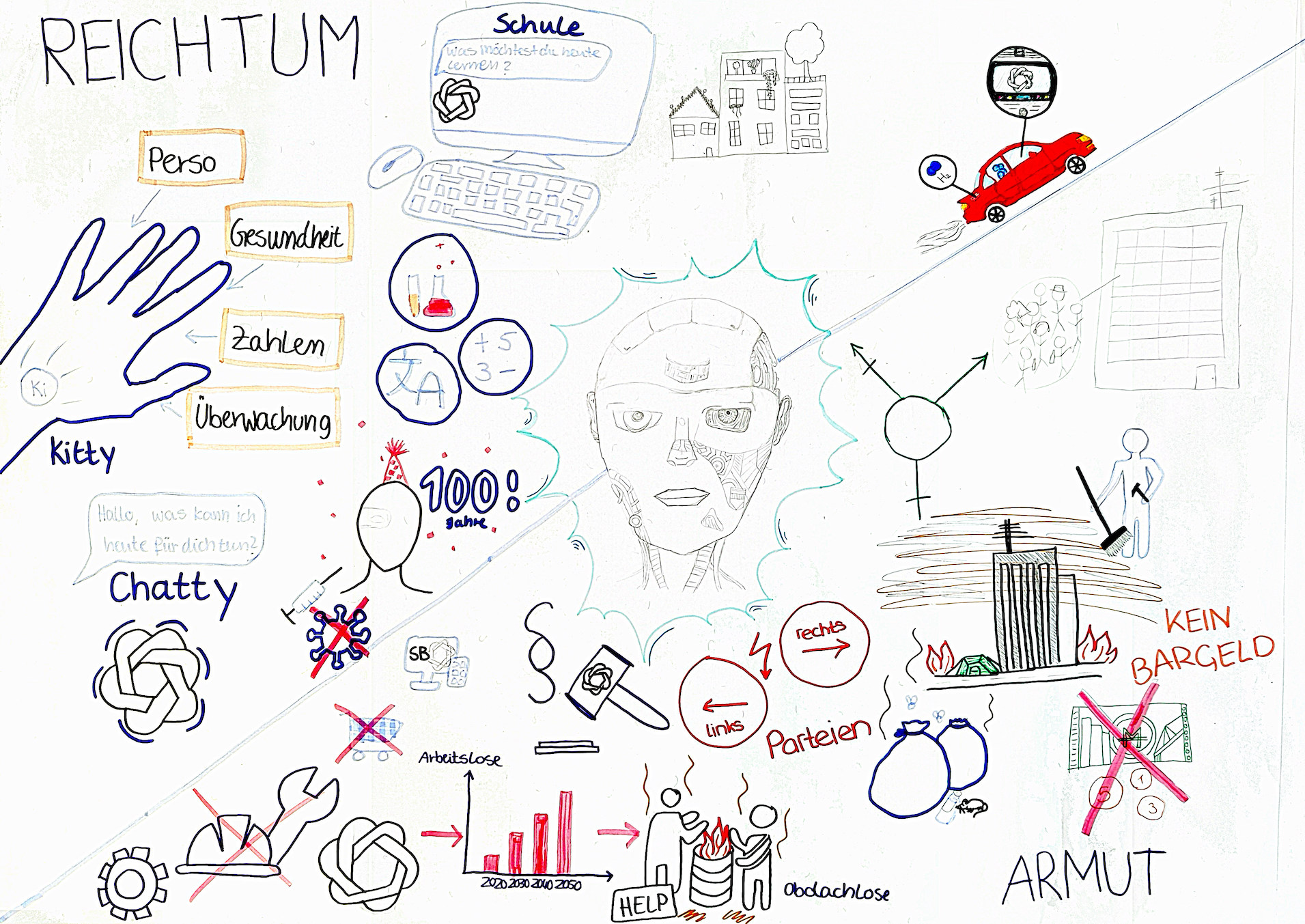 Die Schule wird weiter in Präsenz weitergeführt. Die KI wird aber auch in den Schulalltag integriert. Es gibt aber keine speziell ausgebildeten Lehrkräfte mehr und die Schüler werden von KI-Robotern unterrichtet. Es werden jedoch noch Personen zur Beaufsichtigung der Kinder eingestellt.